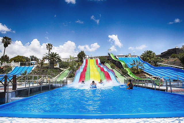 There are swimming pools, water games and two water slides that run between rocks, lava and typical plants of Lanzarote, along with plenty of sunloungers and shaded areas.