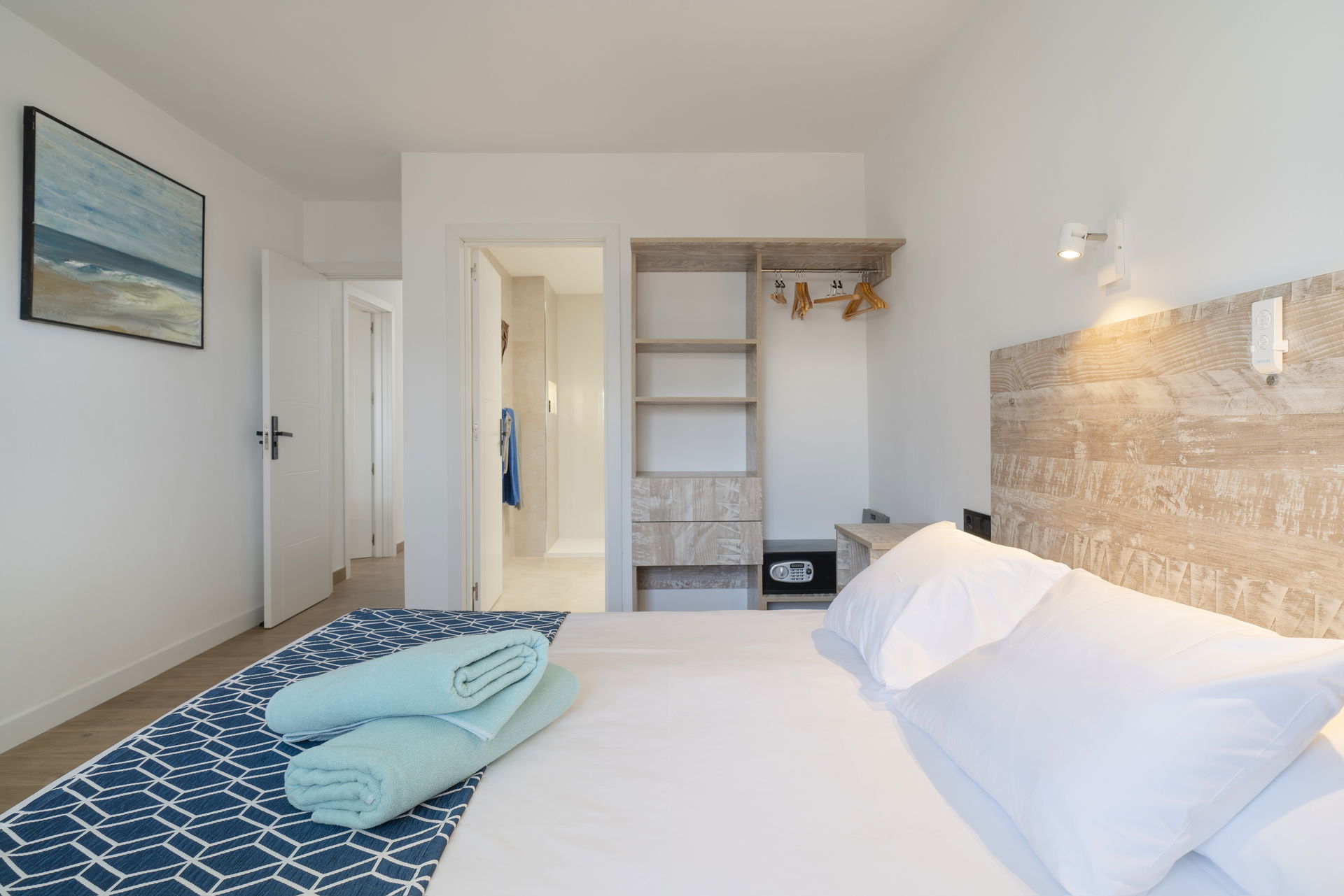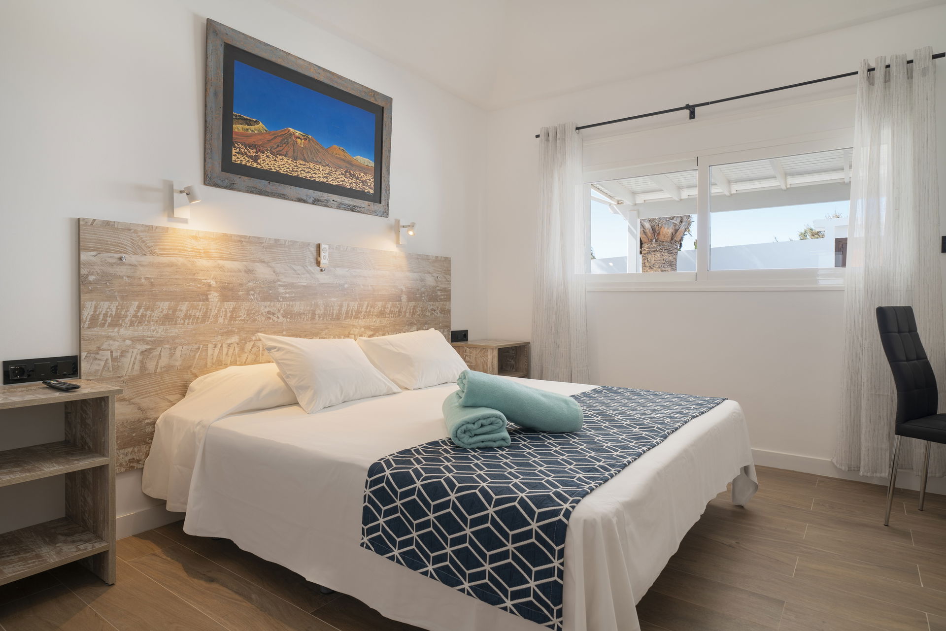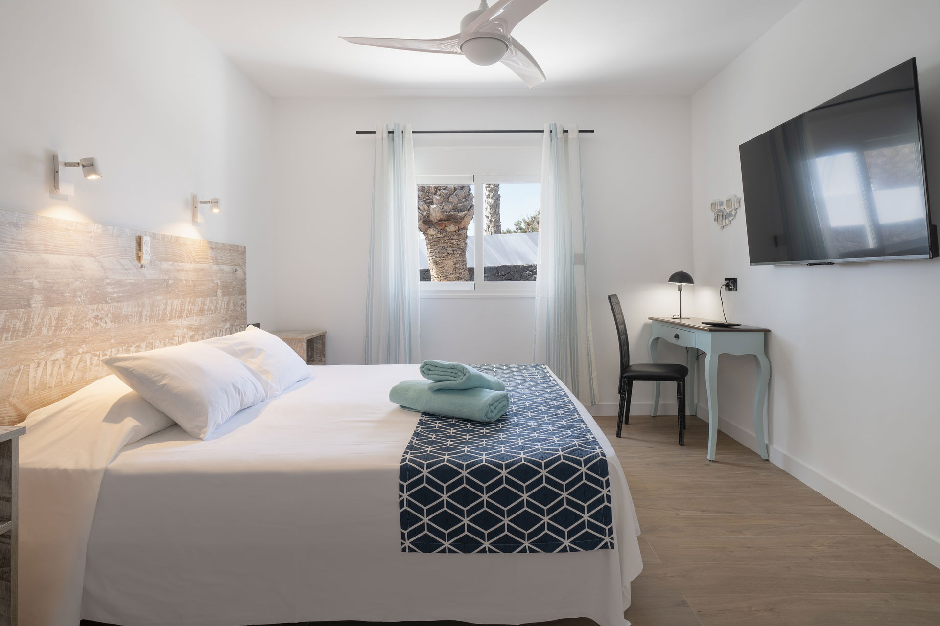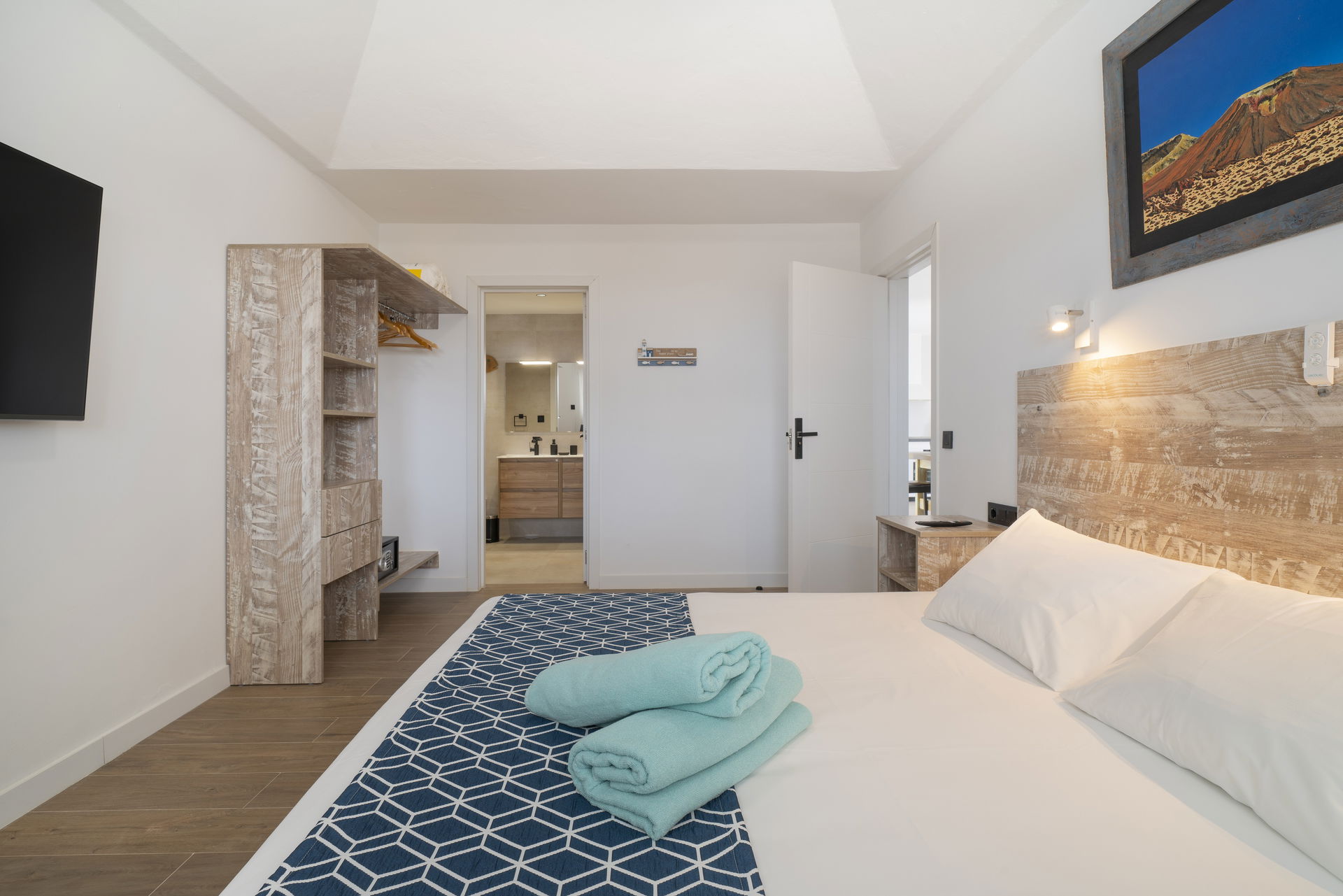 1. Double bed with open wardrobe, reading lamps, dressing table & chair, 55"TV, safe & ceiling fan.