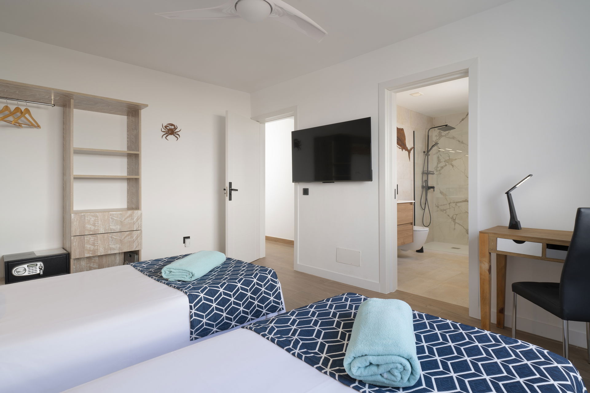 3. Twin beds with open wardrobe, reading lamps, dressing table & chair, 55"TV, safe & ceiling fan.